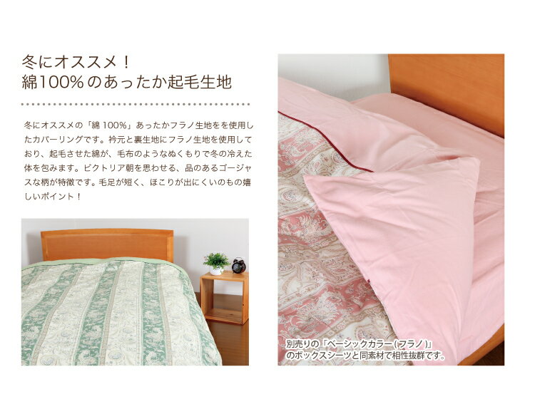 掛け布団カバーの衿と裏地に綿を起毛させた綿フラノ素材を使用。